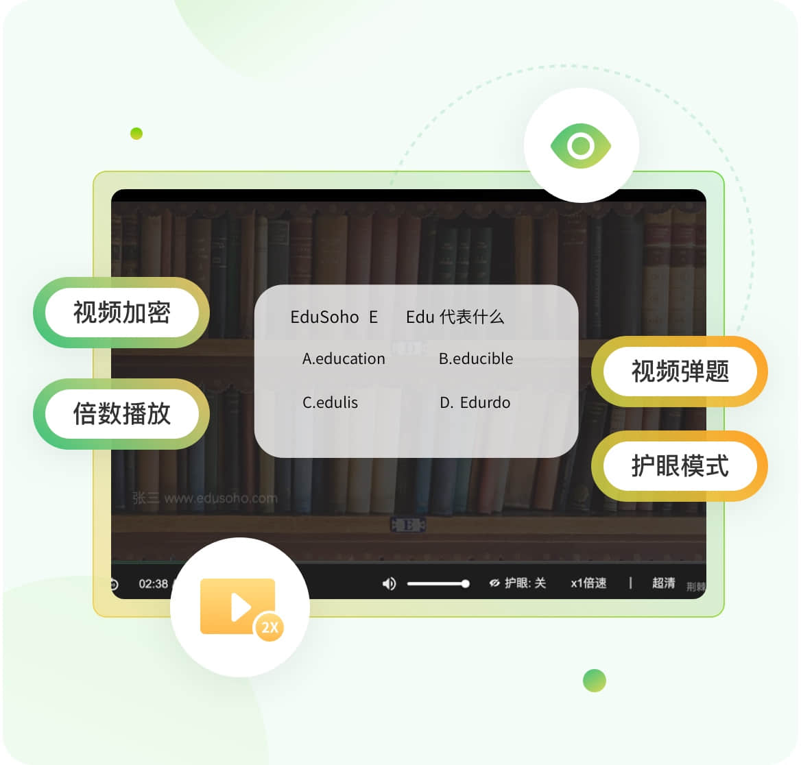 • 視頻點播、文檔點播、視頻彈題、播放數據統計,專為學習場景打造的企業級在線視頻及文檔點播服務。